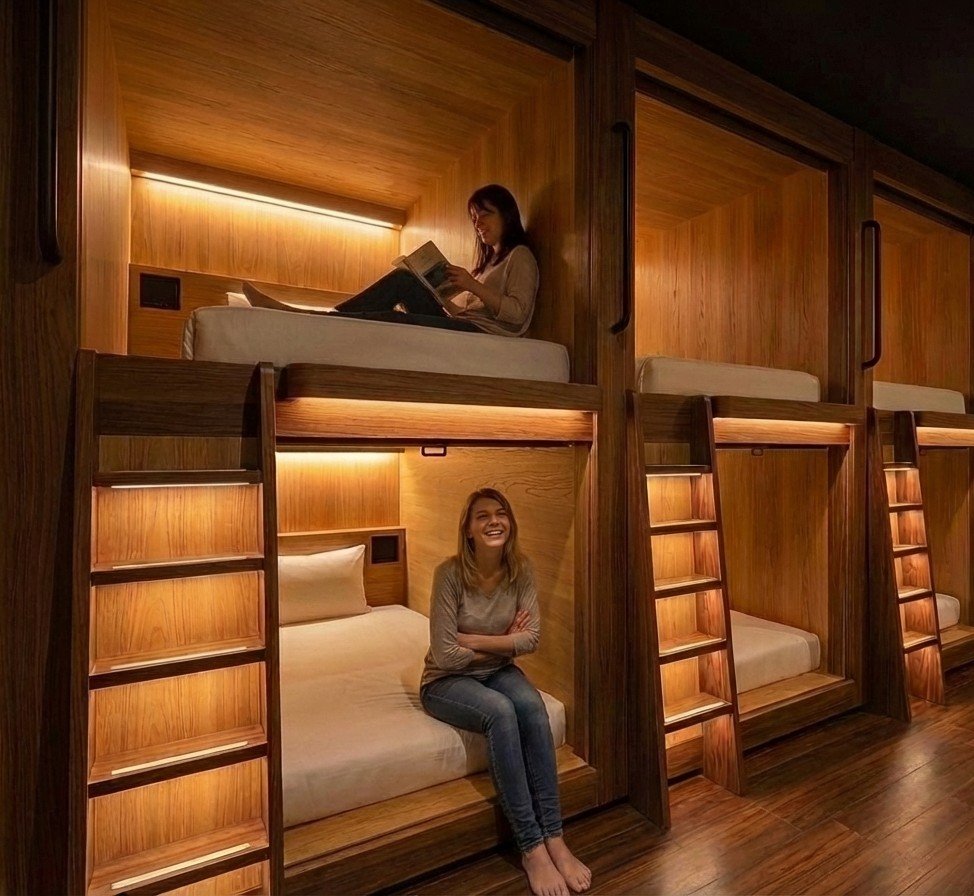 Our capsule-style cabins rethink the experience entirely: giving you a private, design-forward space to recharge, alongside shared spaces for connection, work, and relaxation.